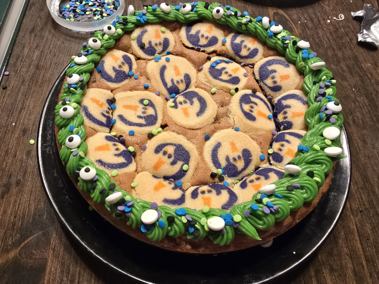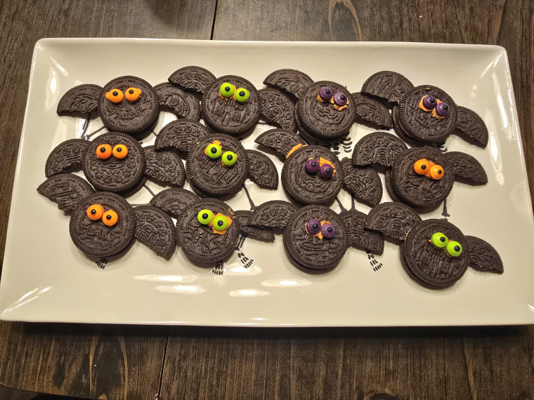 On a different note, I went to a family gathering at my grandmother's home last weekend. And while she is very much the same as she has ever been, I still had fun making some halloween themed treats for the occasion! I made some Oreo bats using Halloween Oreos, and a cookie cake that was part chocolate chip cookie, and part ghost sugar cookie, the Pillsbury type. Here are some pictures of how they turned out!